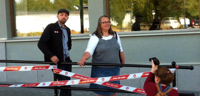 Vänsterpartiet spärrade av Söderports äldreboende i Hageby, mot riskkapitalisterna. Avspärrningsband med texten ”inte till salu” lindades runt räcket vid ingången till äldreboendet. Mona Olsson och Nicklas Lundström intervjuades i egenskap av kommunalråd och ordförande.