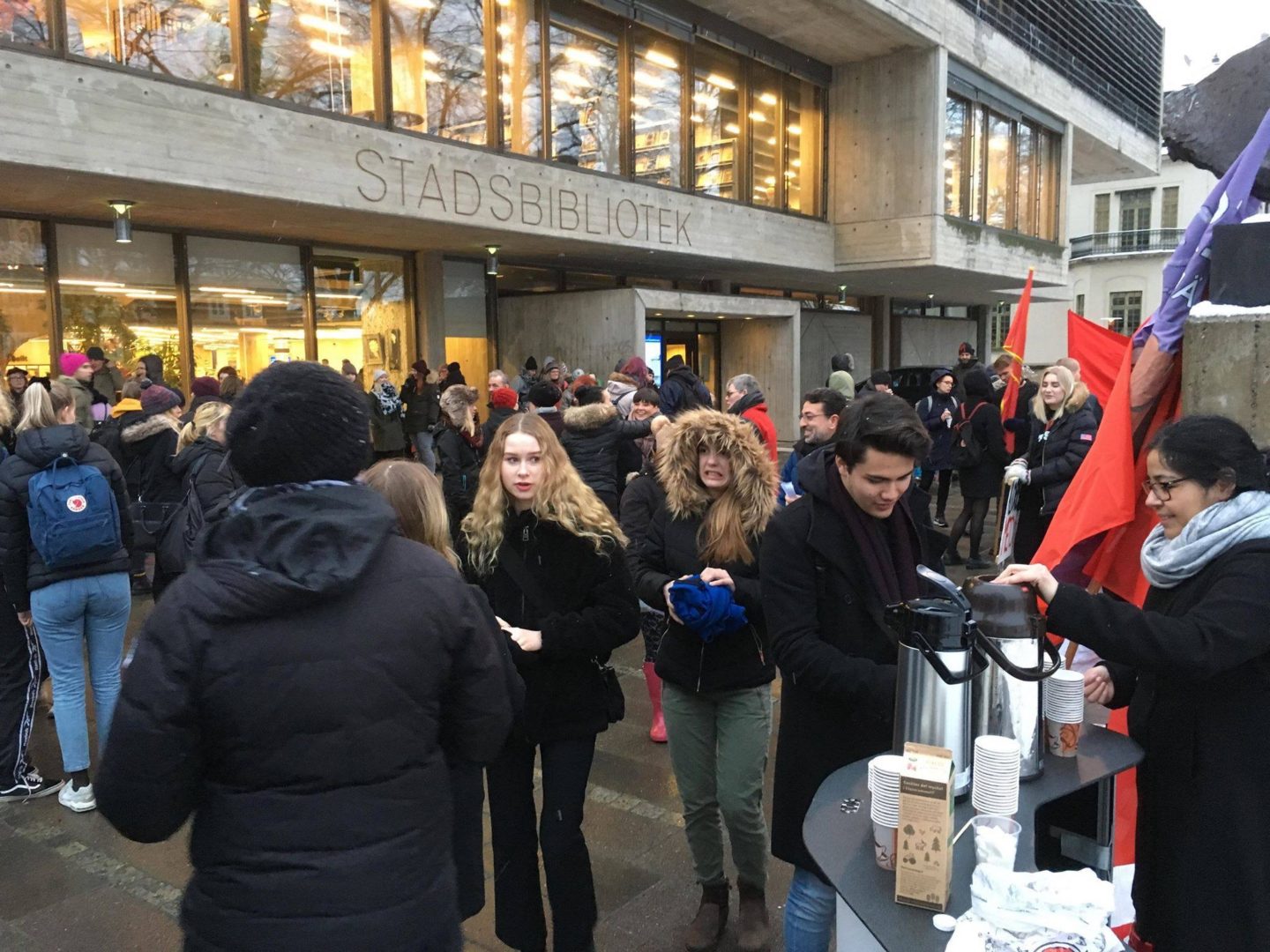 Uppställning innan avfärd. Foton: Nelli Perlman och Ulrika Persson V:s Annika Kaiser. Folkmassan fylldes på mer och mer trots snålblåsten. Runt 150 personer deltog i tåget som gick mot Trappan.