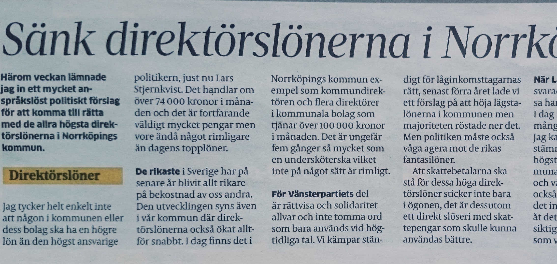 Med anledning av V Norrköpings inlämnade motion med förslag på en ”högsta lön” för en anställd i Norrköpings kommun, skriver Nicklas Lundström på Norrköpings Tidningars debattsida den 12 mars; ”Sänk direktörslönerna i Norrköping!”