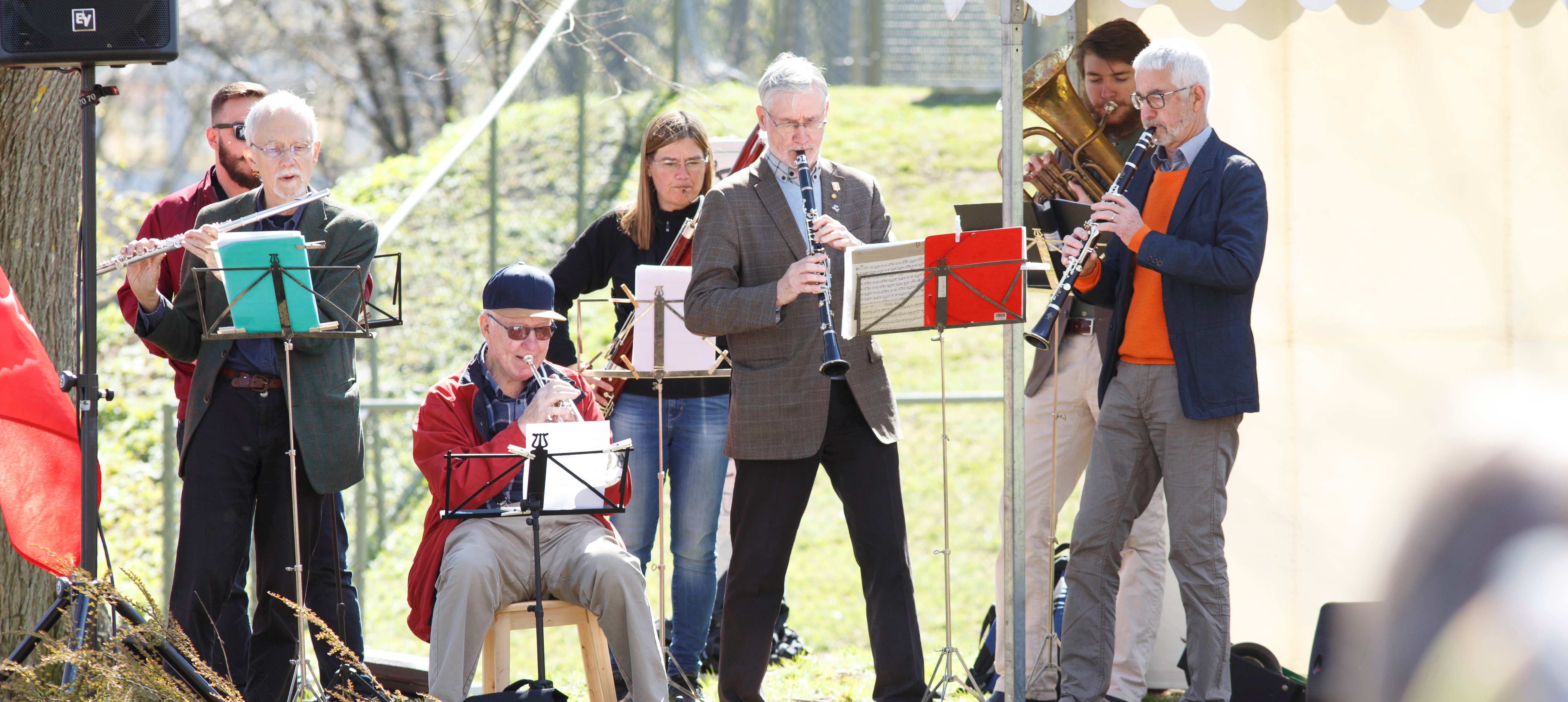 Vänsterblåsarna. Fr. v. Ulf Flodin, flöjt, Ludwig Fungmark, altsax, Sören Holmberg, trumpet, Lena Strömbäck, fagott, Bengt Nordstrand, klarinett, Edvin Bergenfalk, althorn, Lars Gidhagen, klarinett. Saknas på bilden: Helen Alpfjord och Richard Wylde. Foto: Mattias Björkdahl
