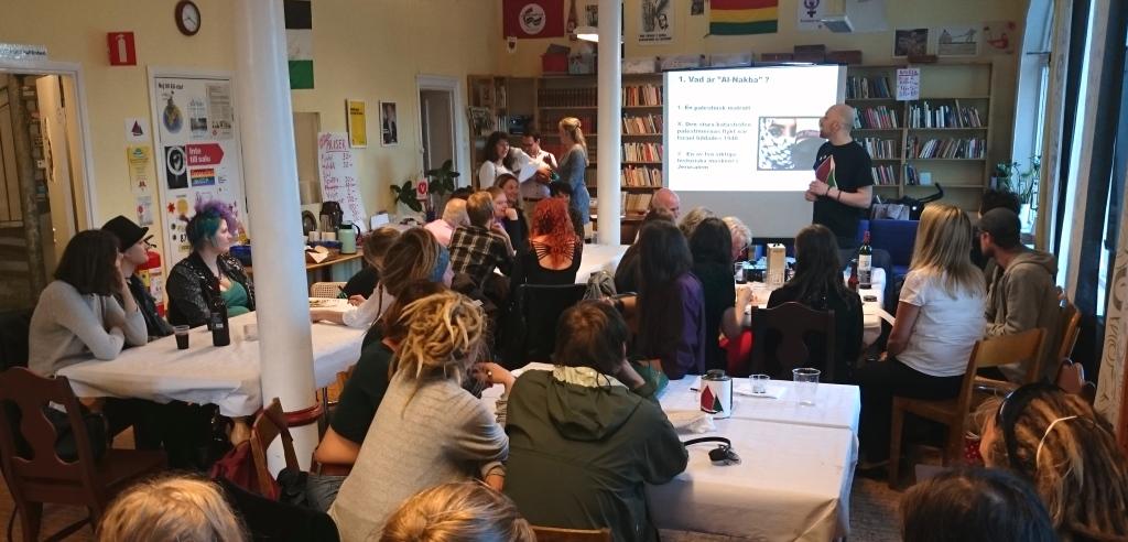 Jeannettes berättelse avslutades med en hälsning via YUOTUBE från kvinnorna i Gaza. En hälsning som berörde oss djupt. Den unga kvinnans sista ord var ”Nu vet vi att vi inte är ensamma!” Precis, solidariteten med Gazas kvinnor, barn och män växer!