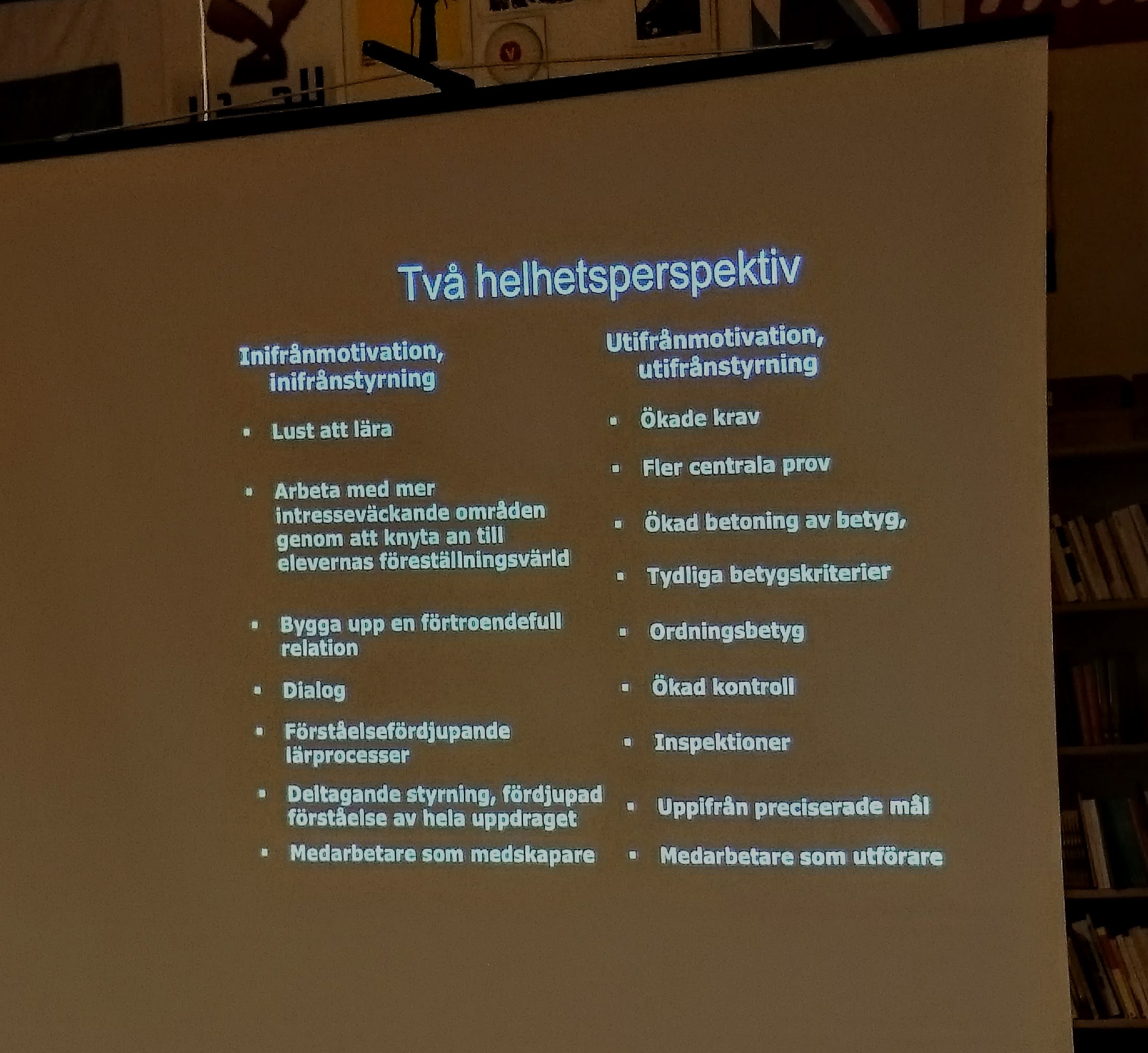 Han berättade om sin forskning och visade på olika problem i skolan, och vilka faktorer som skapat problemen. Han gav konkreta förslag på sätt att jobba vidare och få en skola som utgår från elevens förmåga och medbestämmande, och pedagogens kunskap och medbestämmande.